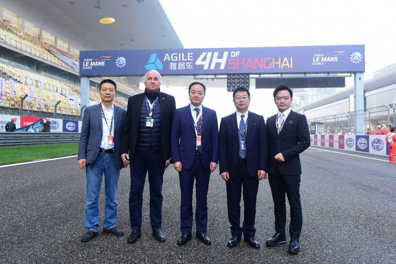 ??▲賽前合影 左起:亞洲(勒芒)汽車運動投 資基金管理有限公司 CEO 曹建偉、ACO(法國西方汽車俱樂部)主席特別顧問 Frederic Henry-Biabaud、雅居樂集團(tuán)控股有限公司副總裁、地產(chǎn)集團(tuán)總裁兼商業(yè)管理集團(tuán)董事長 王海洋、上海力盛賽車文化股份有限公司董事長 夏青、雅居樂地產(chǎn)集團(tuán)副總裁兼產(chǎn)城發(fā)展中心總經(jīng)理 阮家聲